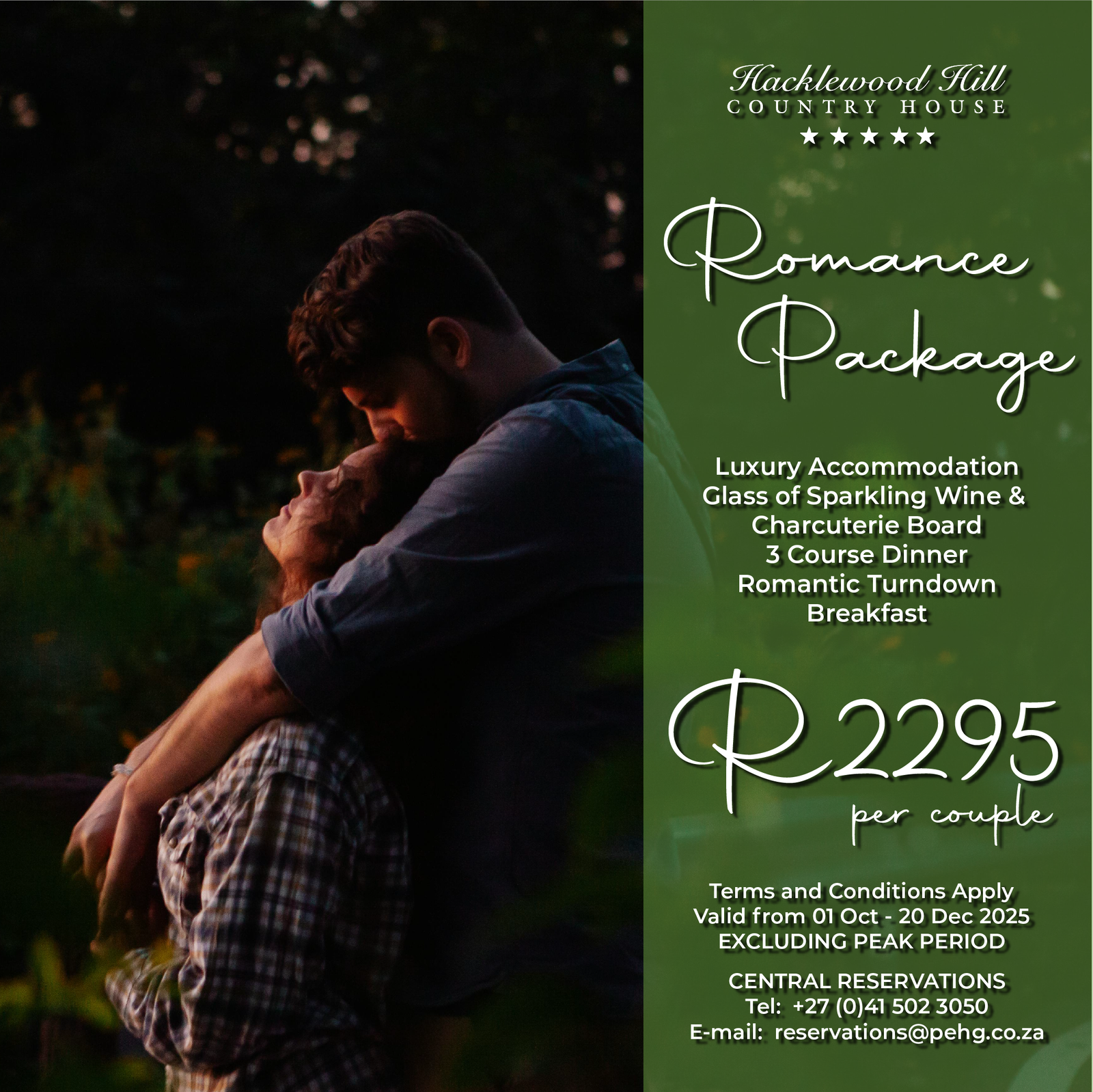 Indulge in the ultimate romantic getaway with our exquisite 5-star luxury romance package, which includes an award-winning dinner—all for just R2295 per couple, per night.